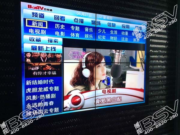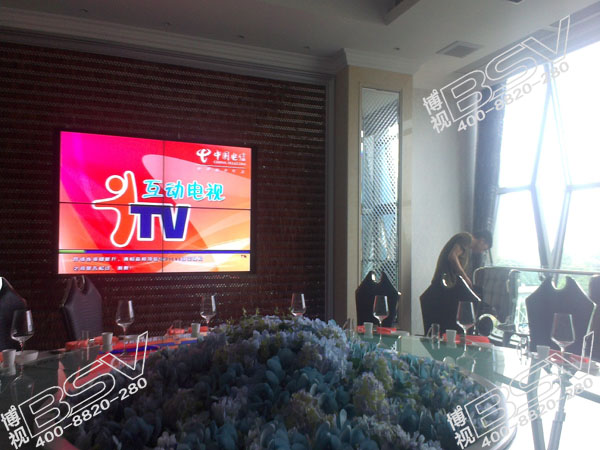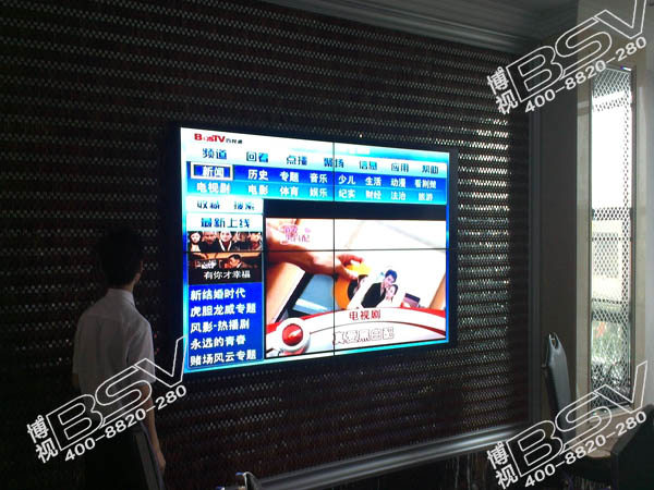 拼接方式:采用武漢博視同創(chuàng)46寸超窄邊拼接屏,2行2列拼接方案,液晶拼接適用了各類視頻播放,流暢度高,利用高清解碼器,播放視頻圖像清晰,色彩鮮艷,擁有良好視角,可為酒店顯示設(shè)備增色不少。